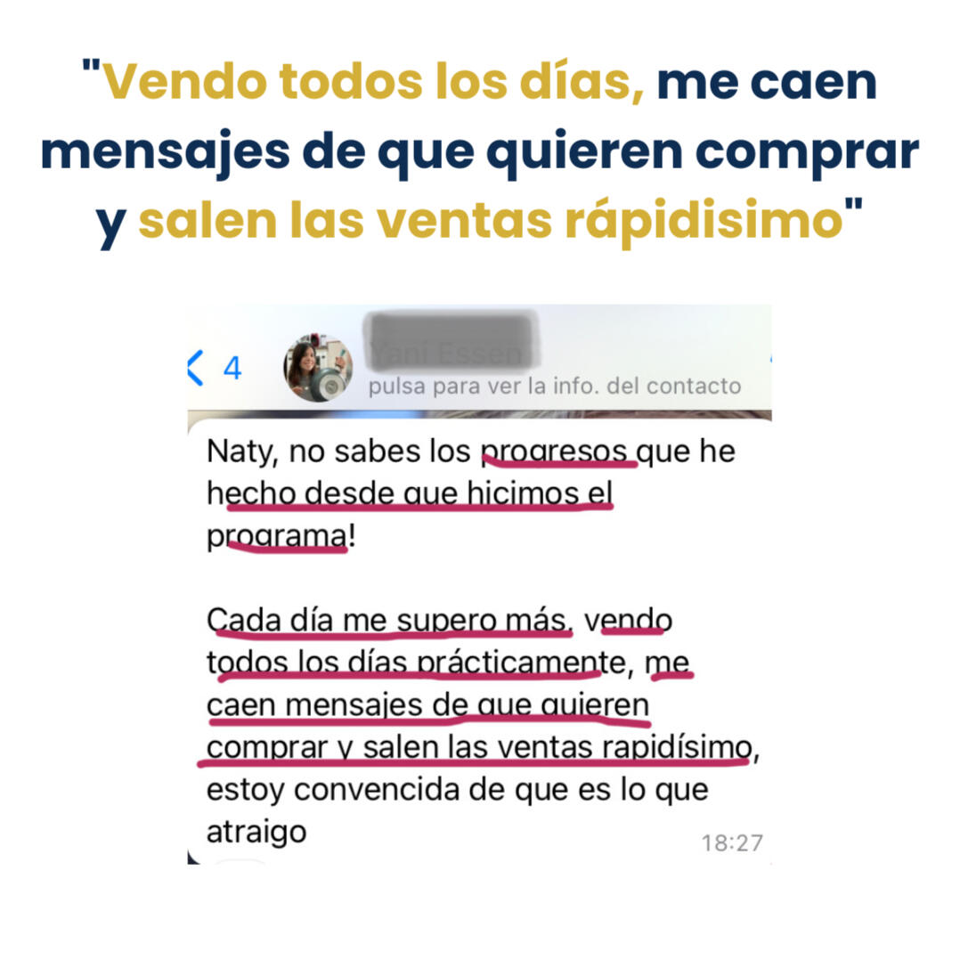 Vas a pasar de hacer llamadas de venta a recibir notificaciones de pago sin perseguir ni convencer a nadie...esa es mi normalidad hoy.Vas a pasar de lanzar ofertas y no ver los resultados de ingresos que quieres a tener una audiencia caliente porque estas creando las ofertas que están listos para pagar.Vas a dejar de rebajar tus precios y comenzar a ser altamente pagada por tu expertis, sin miedo a subir tus precios porque sabes que quienes entran a tu mundo pagarían eso y mucho más por estar y aprender de ti.Vas a pasar de estar con la agenda llena y comenzarás a generar mayores ingresos con tiempo libre, planeando ese viaje a último momento, disfrutando de tu familia, descansando más, mientras cierra ventas por tu DM.Este es el programa que necesitas para pasar de ventas lentas y pesadas, repitiendo estrategias que no funcionan a recibir DMs pidiéndote el link de pago, sin que estés vendiendo constantemente.